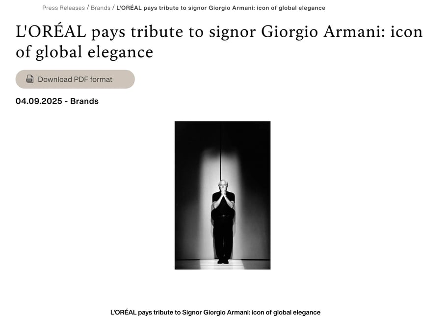 アルマーニ氏の訃報を受け、1988年から協業するロレアルがコメント